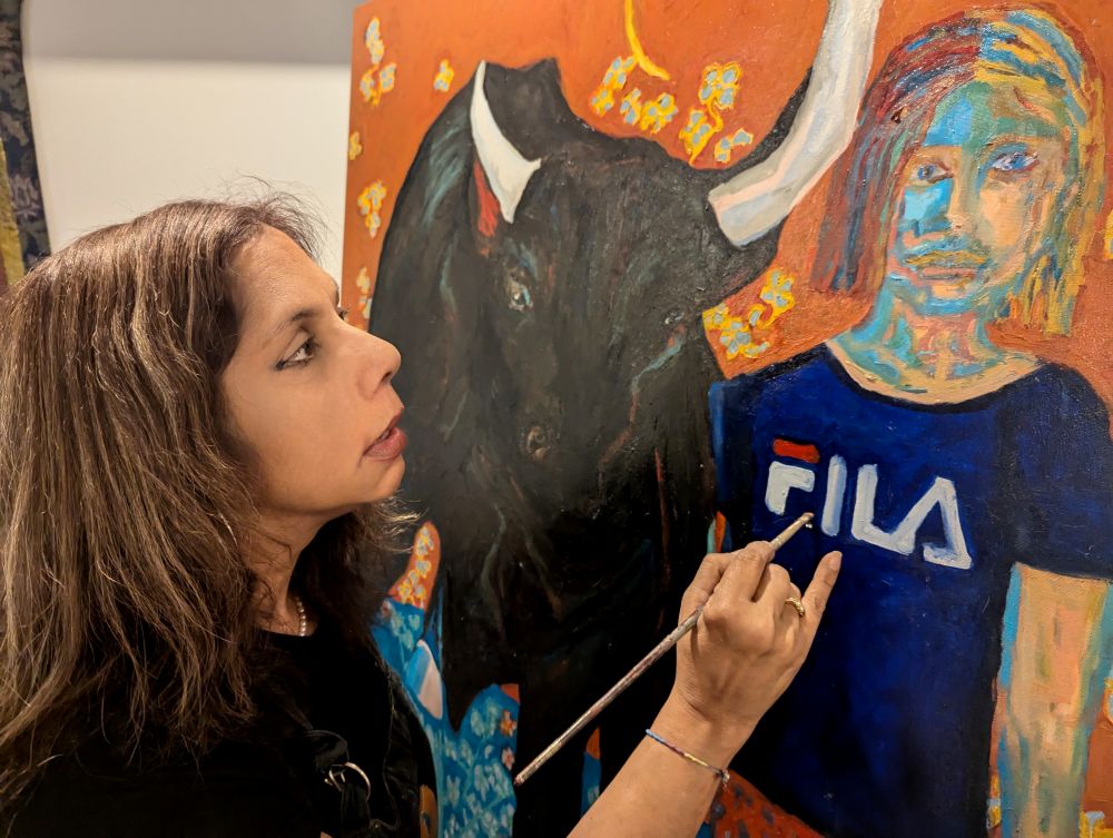 Rather than offering fixed narratives, Charu’s compositions ask the viewer to decode layered references and relationships that unfold gradually. The work reflects both her past professional engagement with issues of intersectionality in diverse global contexts and elements of her personal life, daily observations, and lived experience. All of these inform her ongoing exploration of power, vulnerability, and resilience, often expressed through the playful use of symbolism.