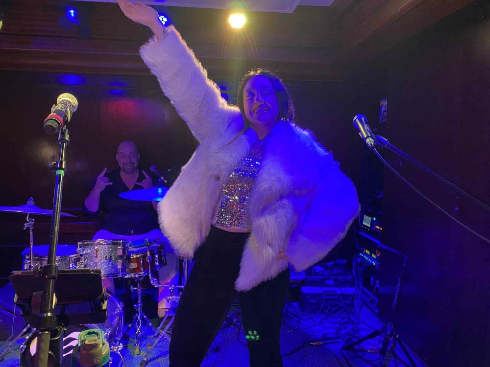 Fun part of the job is dressing up! Here’s me rocking the glitter and faux-fur with my drummer, Ronny, in the background.
