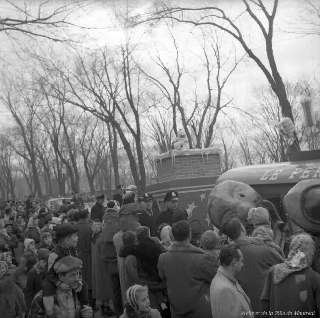 1884 – The Bonsecours Market, Christmas Eve.1957 – Parade in Montréal.1957 – Parade, the Dupuis Frères store train.1957 – Crowd waiting for a helicopter.1957 – Crowds gather at the Christmas Parade in Montréal.1957 – Photograph of a Christmas nativity scene on display in a greenhouse at the Botanical Garden.1957 – Santa Claus in front of a crowd.1958 – Photograph showing an exhibition of Christmas nativity scenes in the gymnasium of Mousseau School Park.1959 – Decorations at the SDC Plaza Saint-Hubert.1959 – Plaza Saint – Hubert.1959 – Santa Claus greeting the crowds at Plaza Saint-Hubert.1959 – Santa Claus near Plaza Saint-Hubert.1959 – Santa Claus on the Christmas Float at Plaza Saint-Hubert.1959 – Various decorations at Plaza Saint-Hubert.1963 – Christmas nativity scene at the Botanical Garden.1966 – Photograph of a Christmas nativity scene in the exhibition greenhouse of the Botanical Garden. It shows an arrangement of flowers next to the figures of Joseph and Mary.1970 – Photograph of Plaza Saint-Hubert at the intersection of Saint-Hubert and Bélanger streets in the evening. Decorations are displayed on the street.1970 – Decorations on Saint-Hubert Street.1975 – Christmas at Plaza Saint-Hubert.1975 – View of a display in a shop window offering Christmas greetings.
